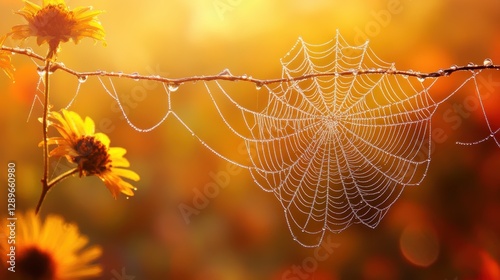 The watermark will not be included on Wall mural.: Beautiful spider web in wild field with dew in morning in spring -