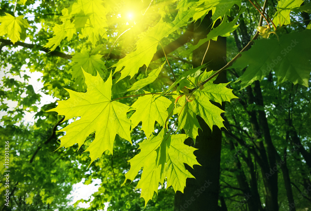 Wall mural beautiful spring leaves of maple tree and sunlight