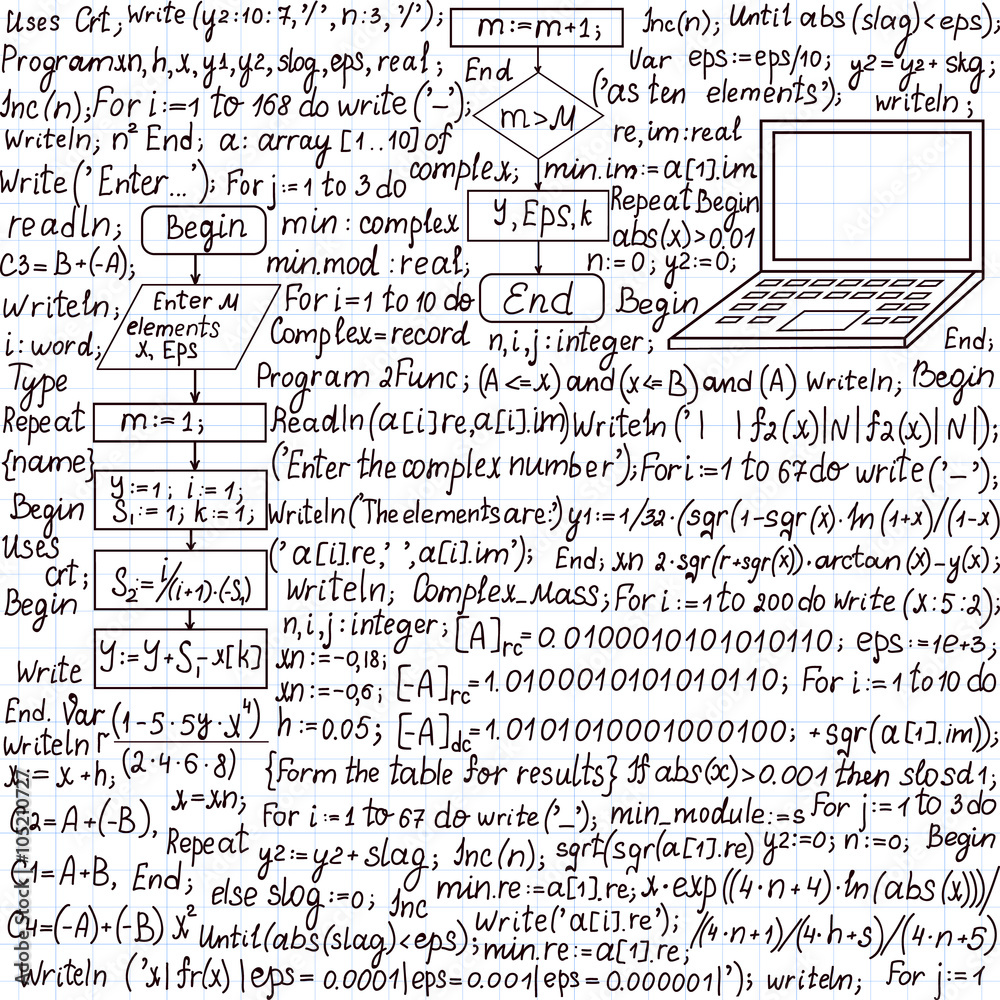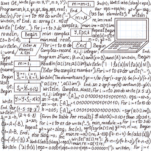 The watermark will not be included on Wall mural.: Beautiful technical vector seamless pattern with programming code, "handwritten on the copybook pape