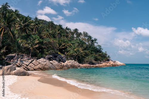 The watermark will not be included on Wall mural.: Beautiful wild sandy beach with palm trees and clear turquoise water