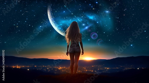 Beautiful young woman stay on earth and watch starry sky moon planet surrealism,generated aiWall mural