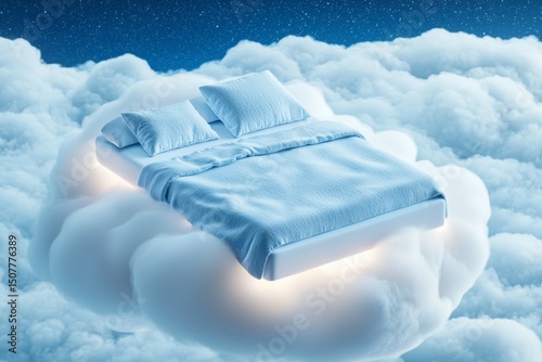The watermark will not be included on Wall mural.: Bed is floating in the sky with clouds surrounding it