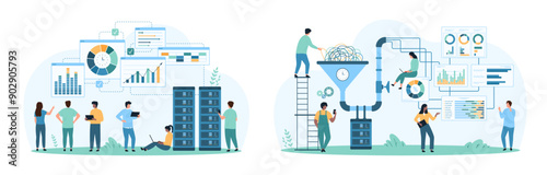 Wall mural : Big data research and conversion process set - tiny people work on digital information with support o
