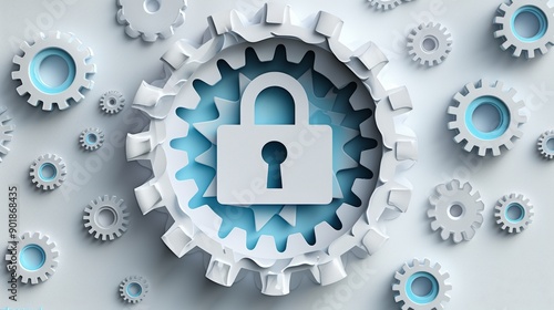 Big data technology and cyber security concept with paper art style gears and lock symbol for digitaWall mural