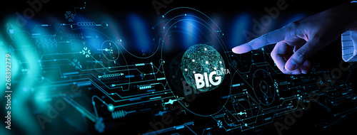 Wall mural : Big data world and globe icon ui with hand selecting and pressing big data symbol and modern interfa