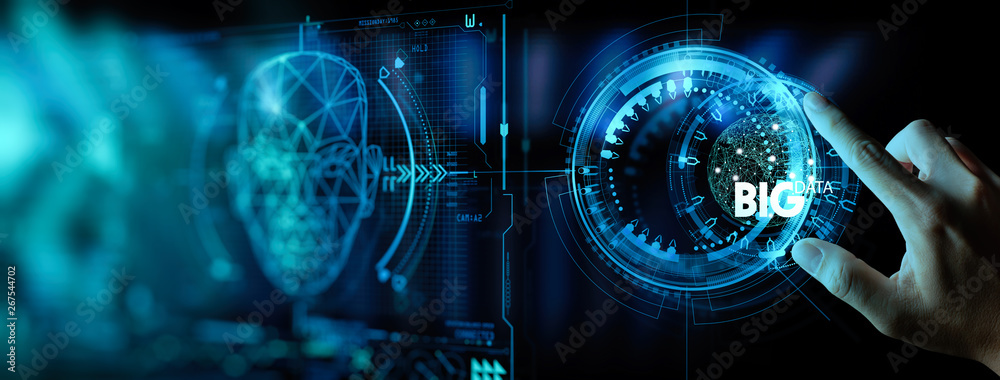Wall mural : Big data world and globe icon ui with hand selecting and pressing big data symbol and modern interfa
