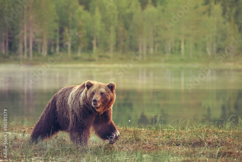 The watermark will not be included on Wall mural.: Big male bear walking in the bog at sunset