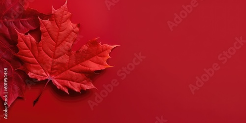 Wall mural big maple leaf with copy space on red background. generative ai.