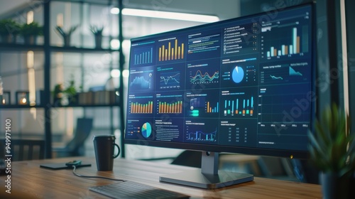 The watermark will not be included on Wall mural.: Big screen showing various graphs with important business data in a modern office
