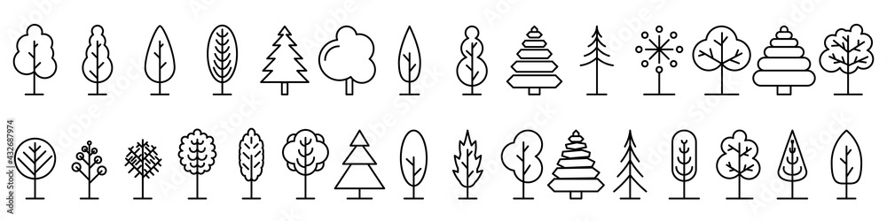 The watermark will not be included on Wall mural.: Big set of minimal trees linear icons - vector illustration