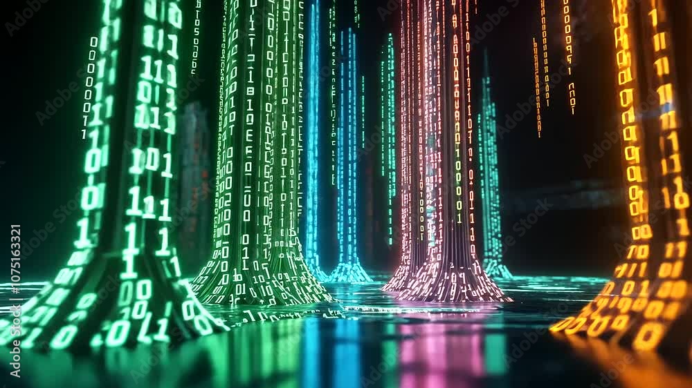 Wall mural : Binary code cascading in neon colors on black background