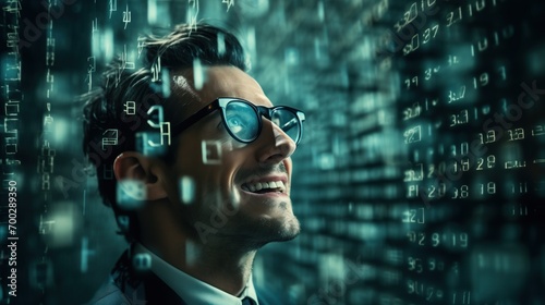 Wall mural binary digits flowing in front of man with glass, developer man, cinematic profile, happy man, showi