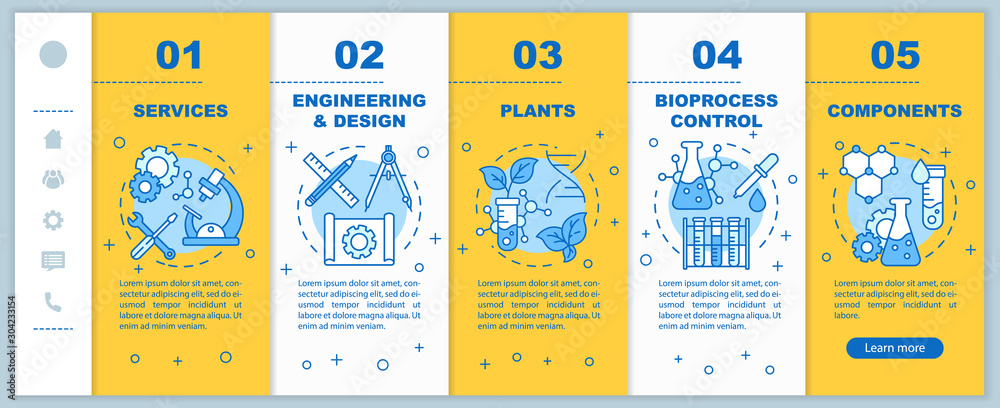 Wall mural : Bioengineering onboarding mobile web pages vector template - services and plants - responsive smartpho