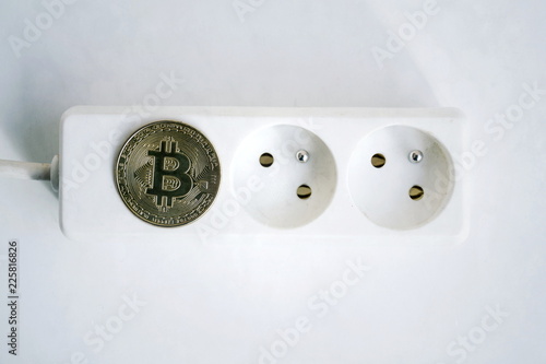 Wall mural : Bitcoin coin lying on power strip extension cord with two empty sockets, cryptocurrency investing, e