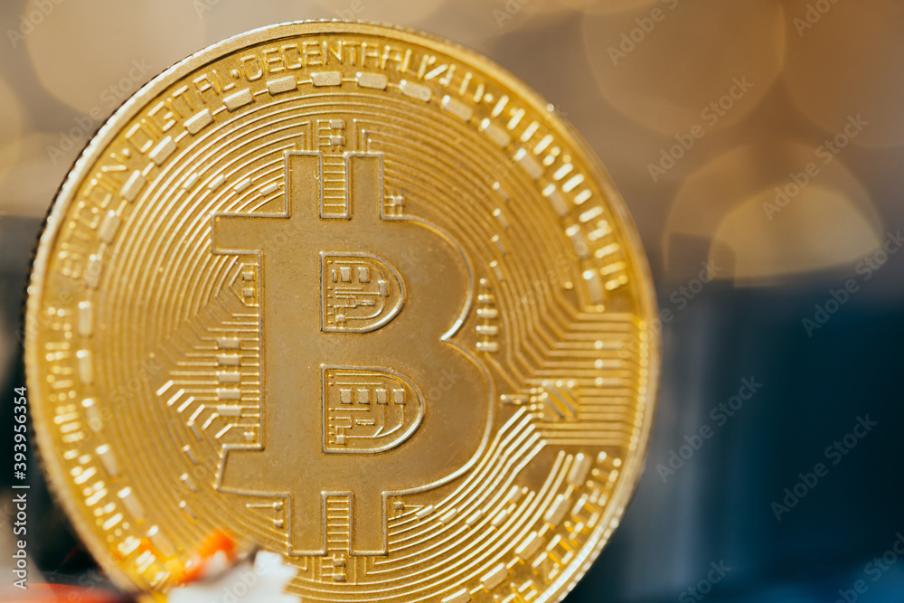 Wall mural bitcoins and new virtual money. gold coin with b.mining icon or blockchain technology