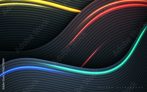 Wall mural : Black abstract wavy dimension background with colorful light decoration