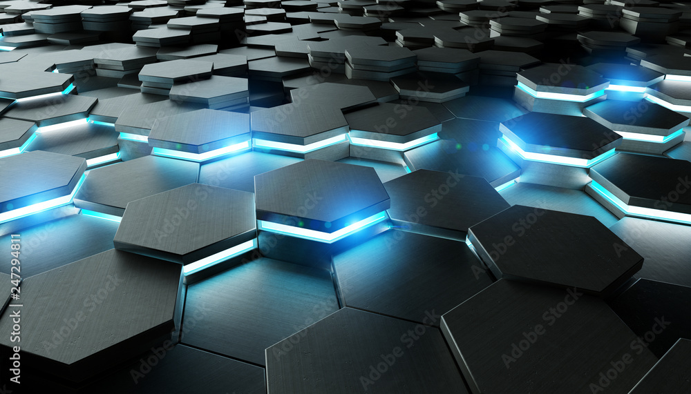 The watermark will not be included on Wall mural.: Black and blue hexagons background pattern 3d rendering