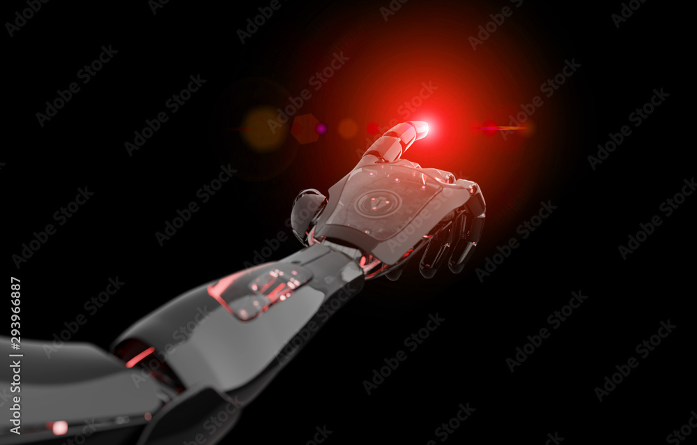 Wall mural black and red intelligent robot cyborg arm pointing finger on dark 3d rendering