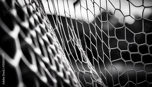 The watermark will not be included on Wall mural.: Black and white close up of a soccer net with intricate patterns emphasizing texture and simplicity
