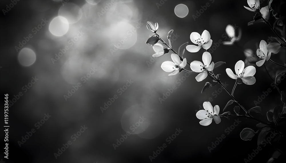The watermark will not be included on Wall mural.: Black-and-white image of abstract bokeh lights glowing softly against a dark backdrop -