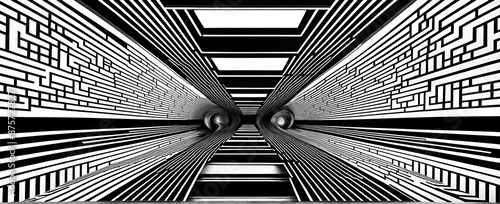 The watermark will not be included on Wall mural.: Black and white tunnel structure representing data and communication in abstract geometric pattern