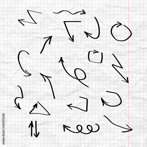 Wall mural : Black arrows are drawn on the background of a crumpled sheet of notebook
