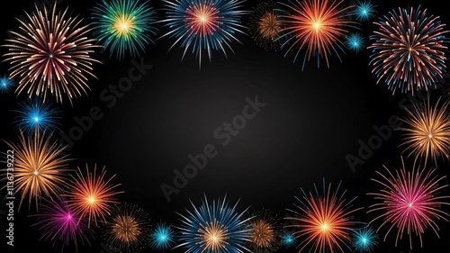 The watermark will not be included on Wall mural.: Black background with border frame of colorful fireworks