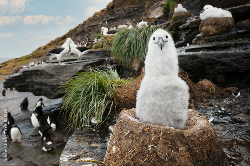 The watermark will not be included on Wall mural.: Black-browed albatross chick sitting in its mud cup nest in falkland islands