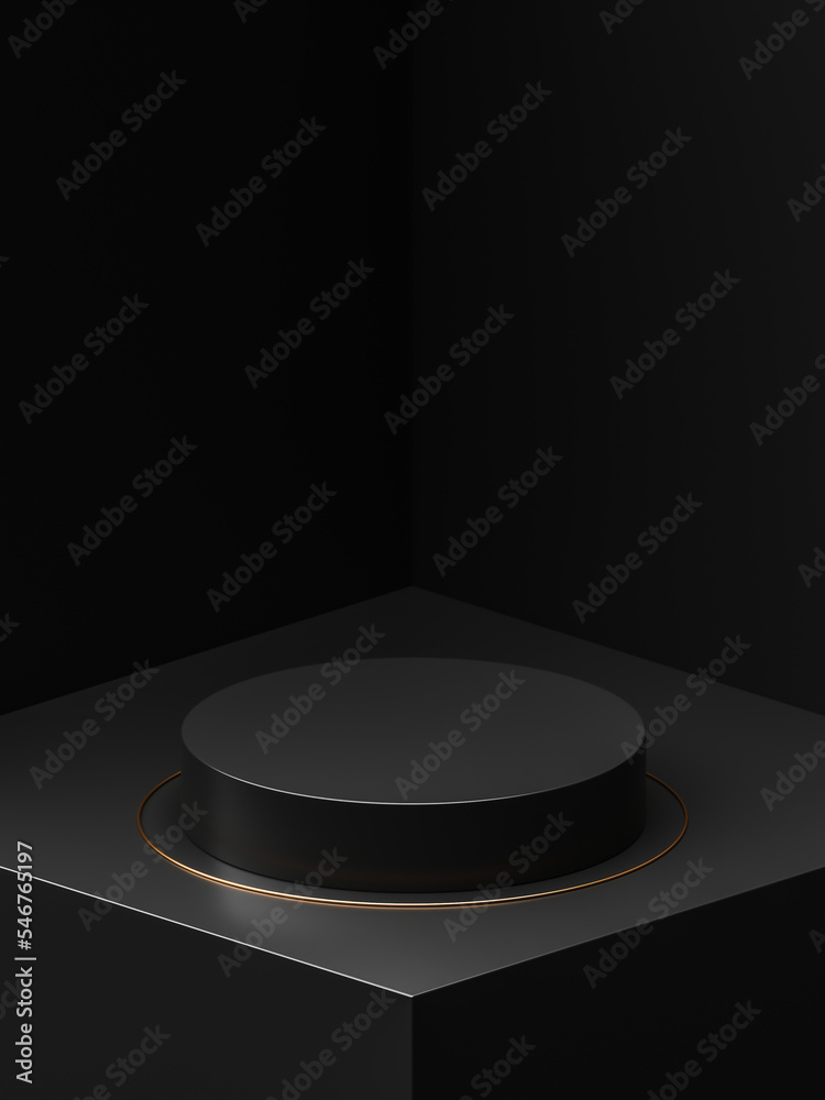 The watermark will not be included on Wall mural.: Black elegant podium 3d showcase stand background with empty dark presentation platform scene or sho
