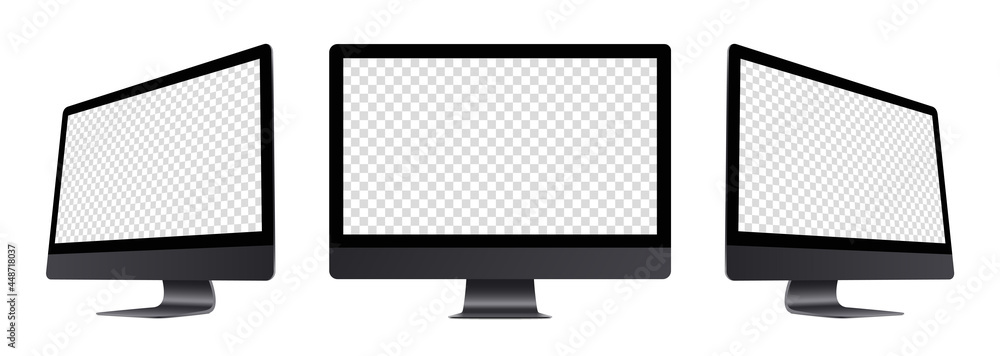 Wall mural black monitor monoblock computer devices mockup set : front, left-side, right-side views. realistic