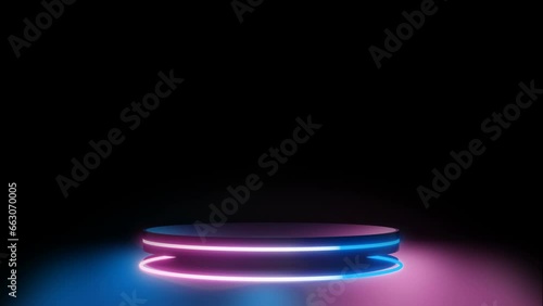 The watermark will not be included on Wall mural.: Black podium with glowing neon ring for product display presentation