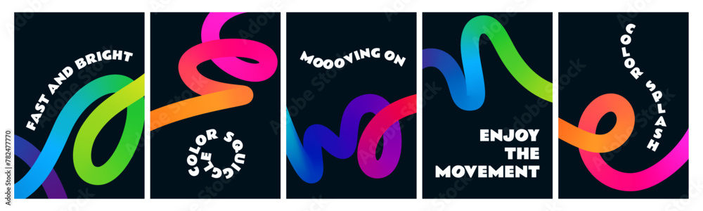 Wall mural black posters with color gradient lines. abstract dynamic colorful shapes on dark background.