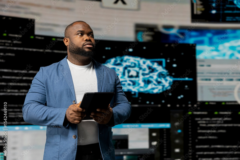 The watermark will not be included on Wall mural.: Black software expert focusing on programming language for innovation, reading binary code on termin