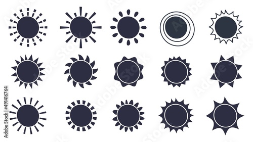 The watermark will not be included on Wall mural.: Black sun silhouette logo icon, suns with sunrays symbols - summer sunshine doodle silhouettes, abstr