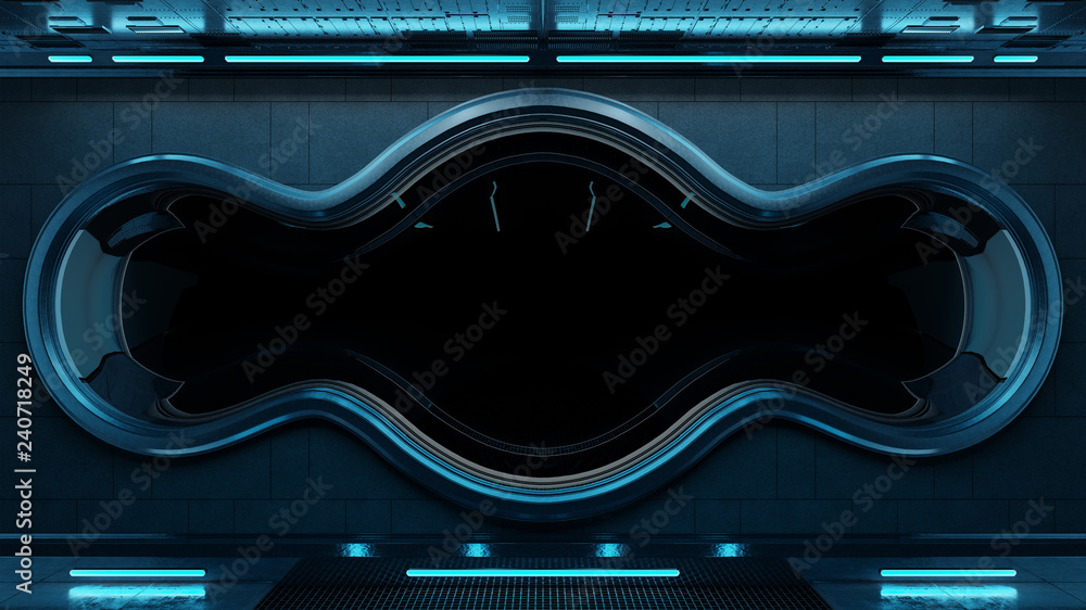 The watermark will not be included on Wall mural.: Black tech spaceship round window interior background 3d rendering