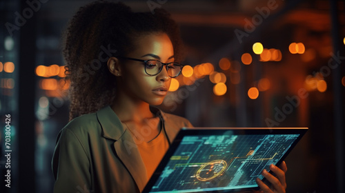 Wall mural black woman with tablet. innovation, research and programming in future information technology.. dev - Wall murals Wall mural black woman with tablet. innovation, research and programming in future information technology.. dev - Wall murals