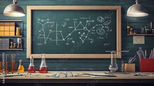 Wall mural blackboard with an array of physics formulas, chemical structures, and scientific symbols in chalk