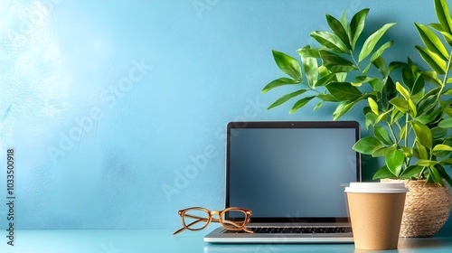 Wall mural blank laptop computer screen on a white desk in a modern clean office interior background there is a - Wall murals Wall mural blank laptop computer screen on a white desk in a modern clean office interior background there is a - Wall murals
