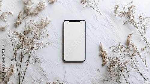 Wall mural blank mockup template of a sleek smartphone on a smooth white background, surrounded by soft shadows - Wall murals Wall mural blank mockup template of a sleek smartphone on a smooth white background, surrounded by soft shadows - Wall murals