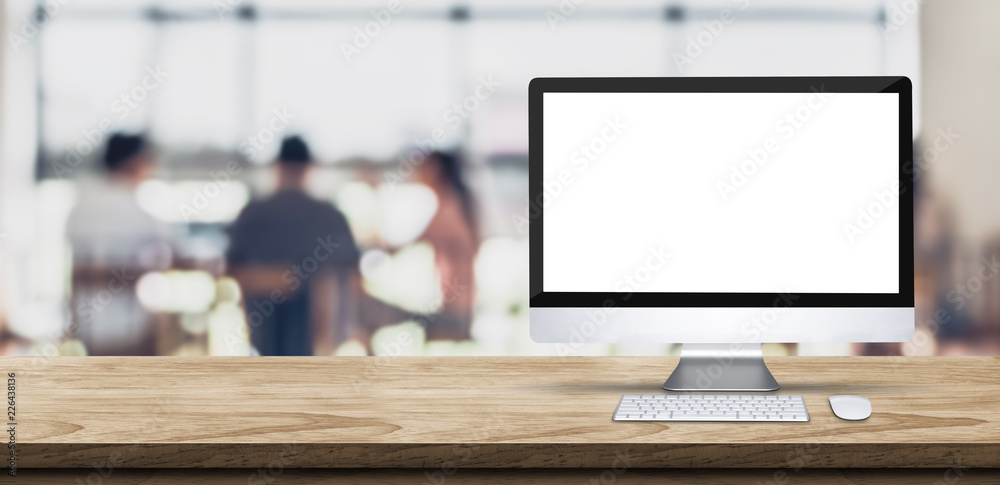 Blank screen desktop computer on wooden table top with blur people working at creative office bokeh Wall mural