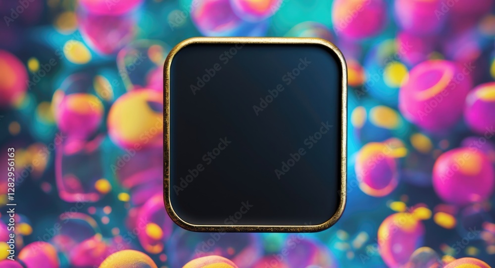 Wall mural : Blank square frame with gold border on colorful abstract background with floating bubbles in shades