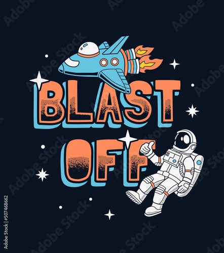 Wall mural blast off slogan graphic with a spaceship and an astronaut vector illustrations. for t-shirt prints
