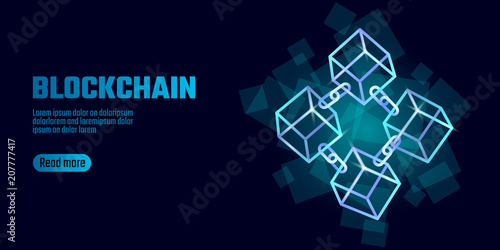 Wall mural blockchain cube chain symbol on square code big data flow information. blue neon glowing modern tren