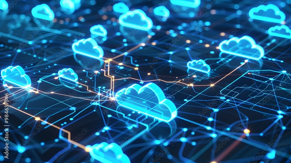Wall mural : Blockchain network visualization with cloud computing nodes ensuring security and transparency