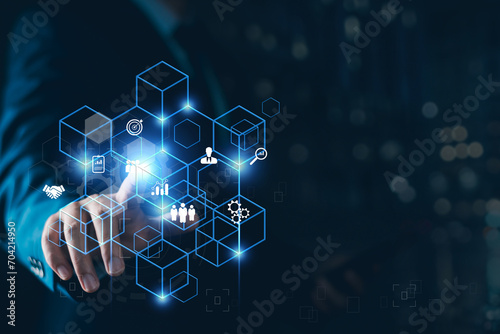 Blockchain technology transaction concept - businessman use laptop on blockchain global networking, dWall mural