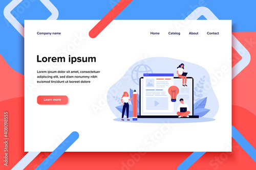 Wall mural : Blog authors writing articles - freelance writers with laptops creating internet content - vector illu