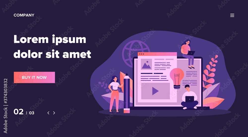 Wall mural : Blog authors writing articles - freelance writers with laptops creating internet content - vector illu