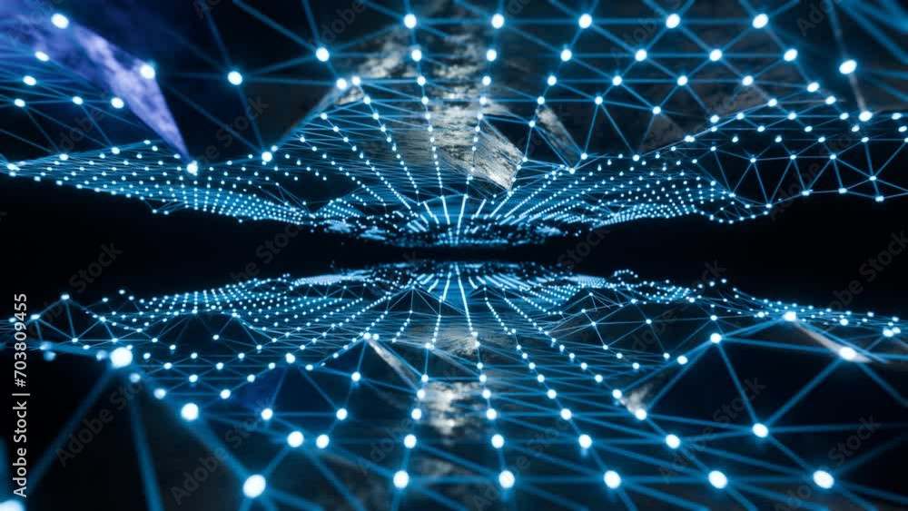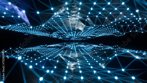 Wall mural blue abstract background with a network grid and particles connected sci-fi digital technology with  - Wall murals Wall mural blue abstract background with a network grid and particles connected sci-fi digital technology with - Wall murals