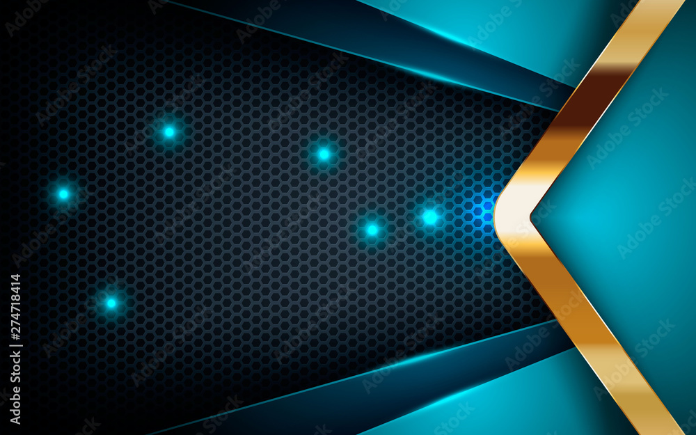 Wall mural blue abstract dimension on dark hexagon background. overlap layers texture with golden list and blue