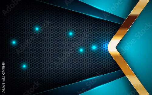 Wall mural blue abstract dimension on dark hexagon background. overlap layers texture with golden list and blue - Wall murals Wall mural blue abstract dimension on dark hexagon background. overlap layers texture with golden list and blue - Wall murals